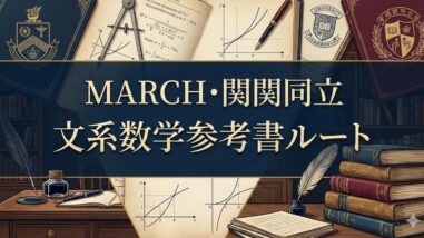早稲田・慶應や旧帝国大学(東大・京大・阪大など)の文系数学で合格点を奪取するための参考書ルート。現在の偏差値別に、最短で実力を伸ばすための具体的な使用書と学習時間を解説。志望校別の優先順位についても詳述しています。
