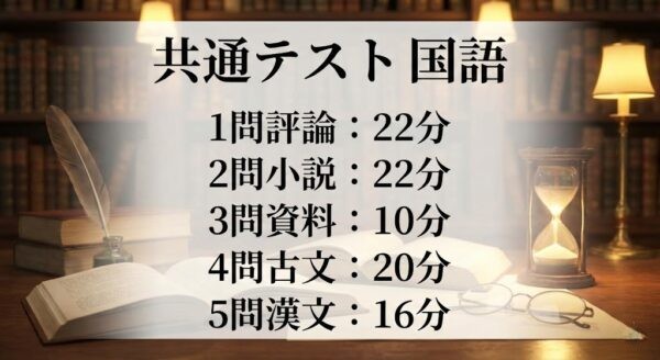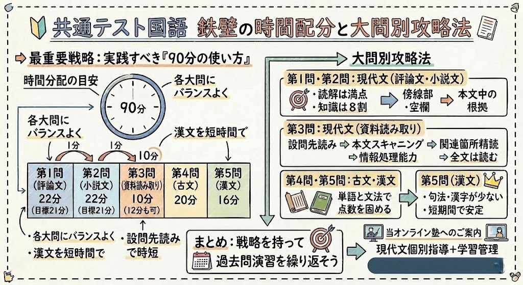 共通テスト国語の成否は、90分という試験時間をいかに配分するかにかかっています。理想的な時間配分は以下の通りです。この時間を意識して過去問や模試に取り組んでみましょう。