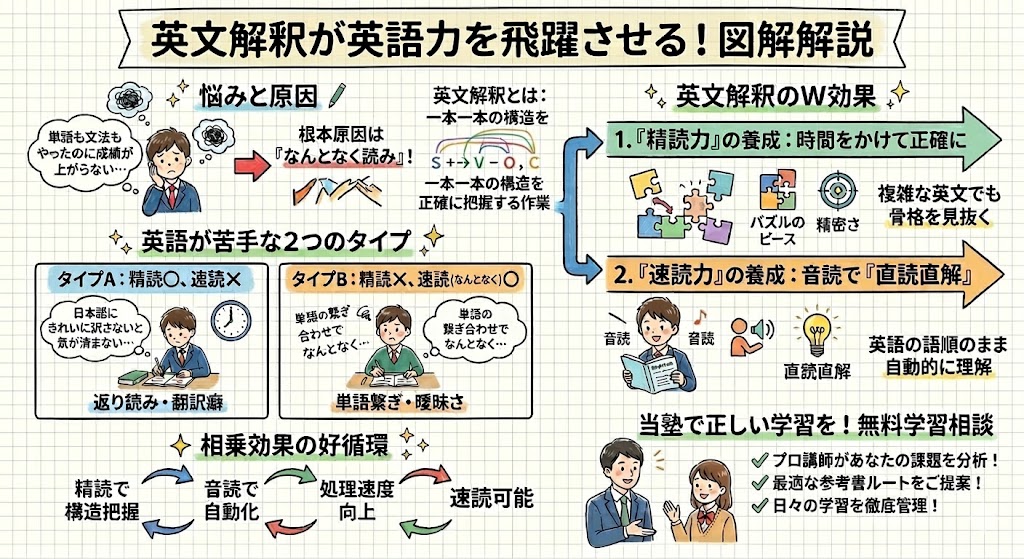 英文解釈とは、一本一本の英文を文法ルールに則って正確に構造を把握し、精密に読み解く作業のことです。面倒で地味に思えるこの作業こそが、あなたの英語力を飛躍させる土台となります。