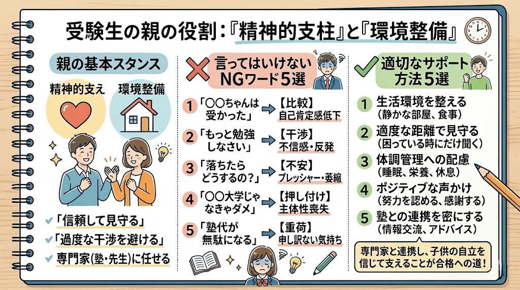 まず、最も重要な前提として保護者の方々が受験勉強そのものに過度に干渉することは避けるべきです。
