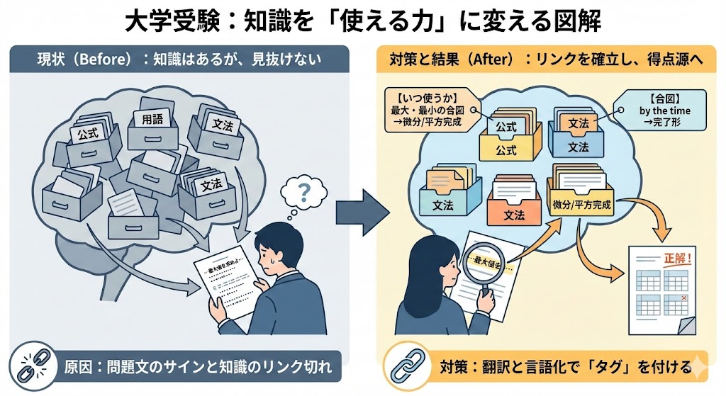多くの試験問題では、教科書通りの表現がそのまま使われるわけではありません。問題文特有の言い回しや条件提示がなされます。 解けない人は、問題文にある日本語や与えられた条件を、「これはつまり、参考書で言うところの〇〇という知識を使う場面だ」と変換するプロセスが抜け落ちているのです。