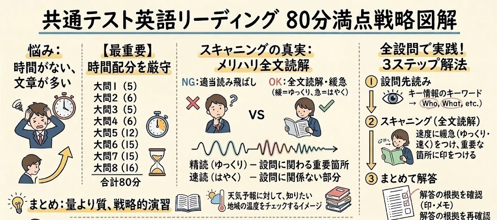 この記事では、高得点奪取に欠かせない「超効率的な時間配分」と「情報スキャニング」という強力な読解テクニックを徹底解説します。これをマスターすれば、あなたも80分で全問を解き切り高得点を狙えるようになります。