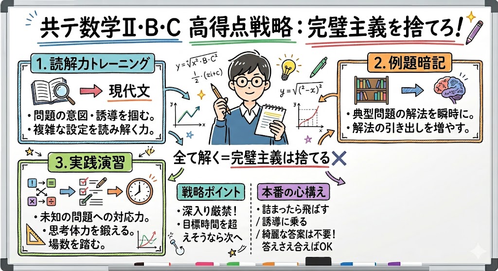 共通テスト数学Ⅱ・B・Cで成功する秘訣は、完璧を目指さない勇気とそのための周到な準備です。「読解力」「例題暗記」「実践演習」の三本柱で実力をつけ、本番では「冷静な時間配分」と「捨てる勇気」で確実に点数を積み重ねていきましょう。
