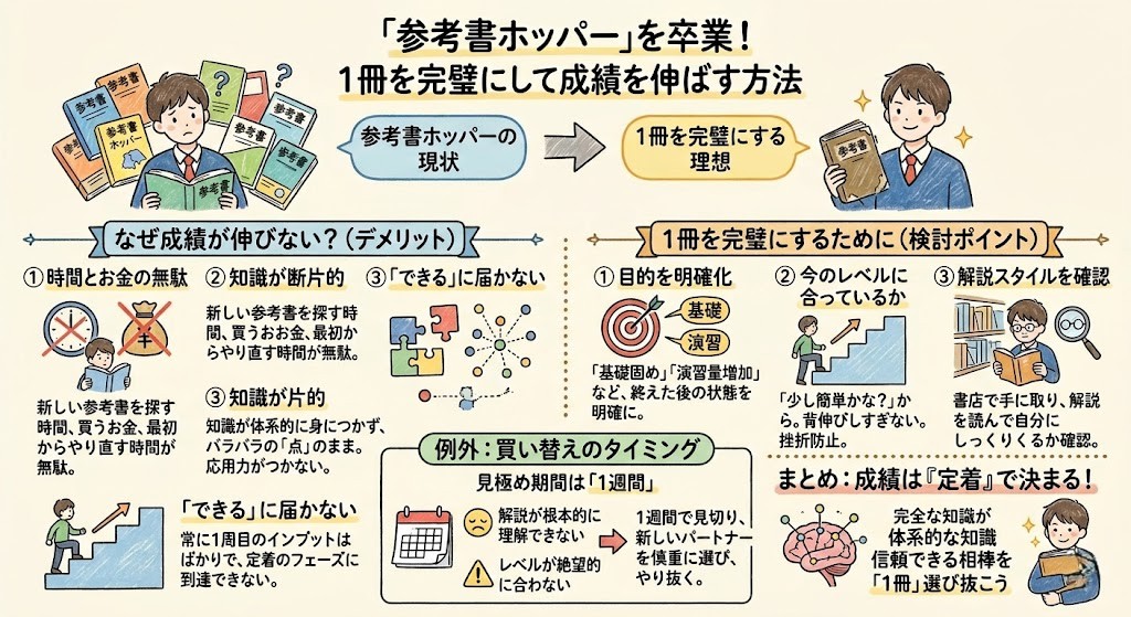 この記事では、なぜ参考書をコロコロ変えることが危険なのか、そしてどうすれば自分に合った1冊を「最強の武器」に変えられるのかを解説します。