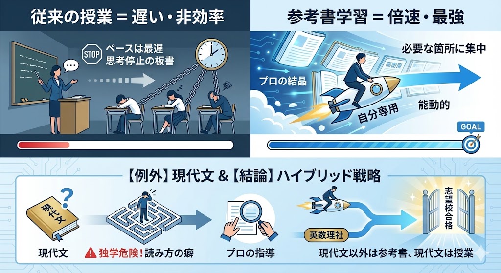 残酷な事実ですが、授業を受けている時間は成績が最も伸びない時間です。 今回は、なぜ「授業」が非効率で、「参考書学習(独学)」こそが最強の学習法なのかをロジカルに解説します。ただし、一つだけ「独学では危険な科目」が存在します。その例外についても包み隠さずお伝えします。