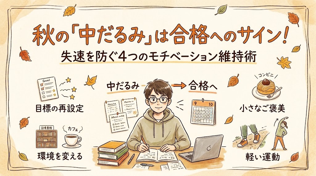 秋になると、多くの浪人生がこのような「中だるみ」に直面します。これは、あなたの意志が弱いからではありません。むしろ、春から一生懸命走り続けてきた証拠であり、合格までに多くの受験生が通るごく自然な踊り場なのです。