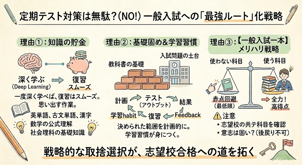 もし「推薦・総合型選抜は一切使わない。一般入試一本で勝負する」と固く決意しているのであれば、話は別です。その場合、一般入試で使わない科目の定期テストは優先度を下げるという選択も戦略の一つです。