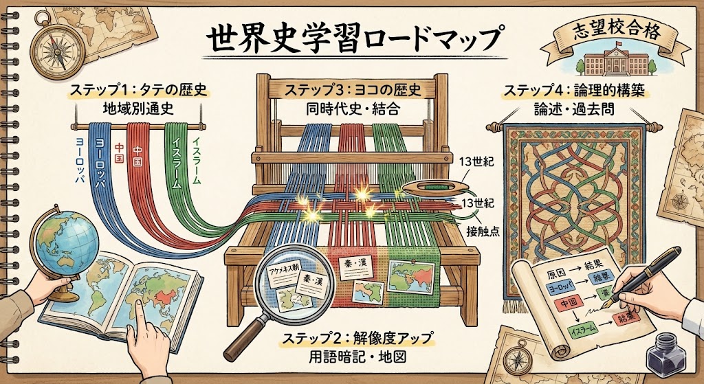 多くの受験生が失敗するのは、「タテ糸(各国の流れ)が張られていないのに、いきなりヨコ糸(同時代の繋がり)を通そうとする」からです。これでは布は織れません。まずは地域ごとのストーリーを固め、その後に時代ごとの横串を刺す。この順序が絶対です。
