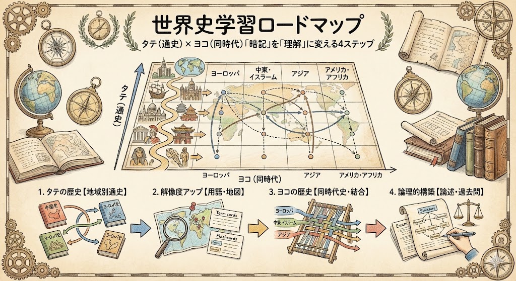 多くの受験生が失敗するのは、「タテ糸(各国の流れ)が張られていないのに、いきなりヨコ糸(同時代の繋がり)を通そうとする」からです。これでは布は織れません。まずは地域ごとのストーリーを固め、その後に時代ごとの横串を刺す。この順序が絶対です。